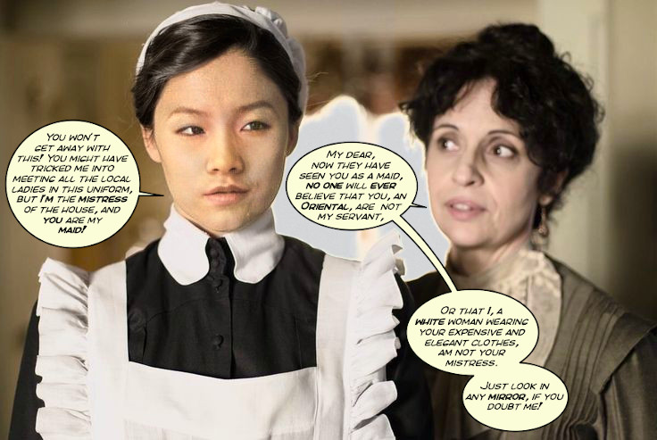 "My dear, now they have seen you as a maid, no one will ever believe that you, an Oriental, are not my servant, or that I, a white woman wearing your expensive and elegant clothes, am not your mistress. Just look in any mirror, if you doubt me!"